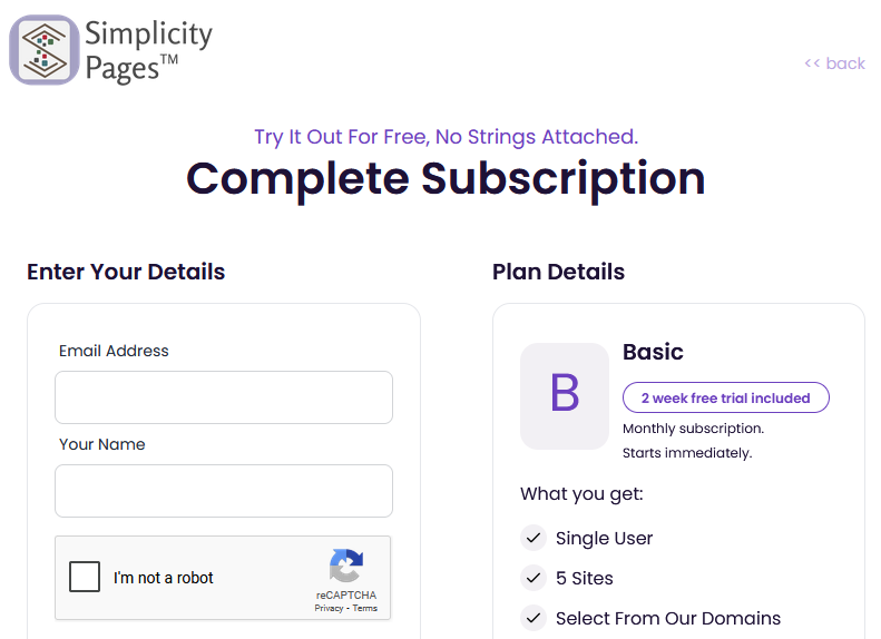 SimplicityPages™ is a single page web site builder and hosting platform. It allows you to set up and deploy a single page website with a focus on simplicity.
